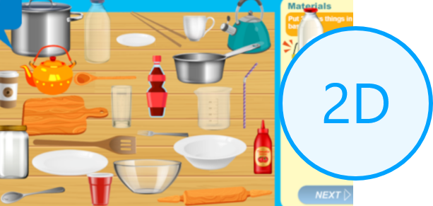 The 2D Magic Kitchen covers Nouns, Descriptive words, Prepositions and More. The 3D Magic Kitchen gives access to 3 discrete recipes complete with 3D environment and animations.